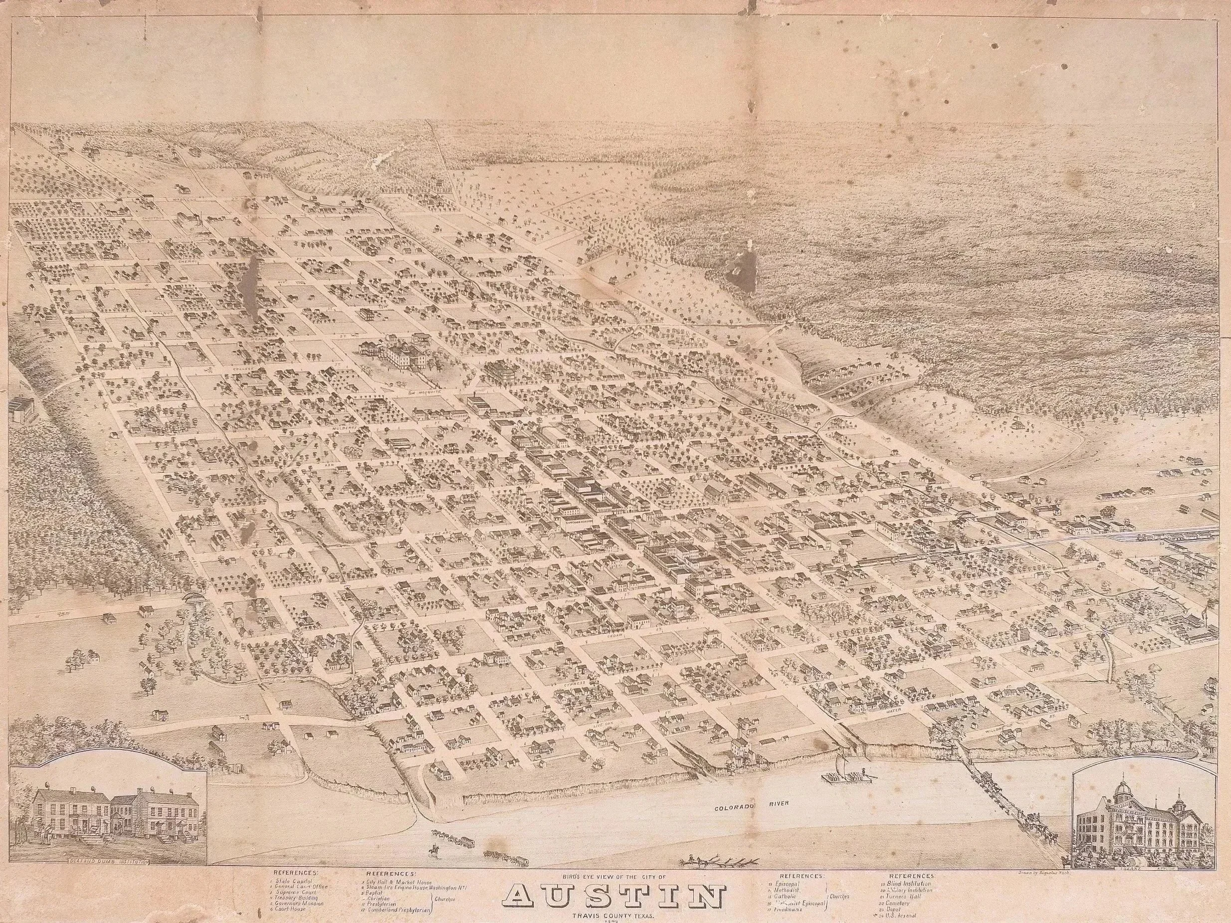 Long before it was surrounded by the fourth-largest Texas metro area, the area now known as Judges Hill was a literal wilderness. Shoal Creek marked Austin’s original western boundary when the city was laid out in 1839. Long before that, Native American tribes used the area for hunting and gathering, taking advantage of the creek’s access to both hills and plains. The Tonkawa were the primary pre-European inhabitants, with Lipan Apaches, Wacos, and later Comanches also using Shoal Creek as a travel route. Evidence of this deep history remains today through burial mounds and flint arrowheads found along the creek’s banks. When Edwin Waller platted the city in 1839, this land was designated as “outlots” on the far western edge of the new capital, a rugged landscape bordering Shoal Creek that was still subject to raids by indigenous tribes.